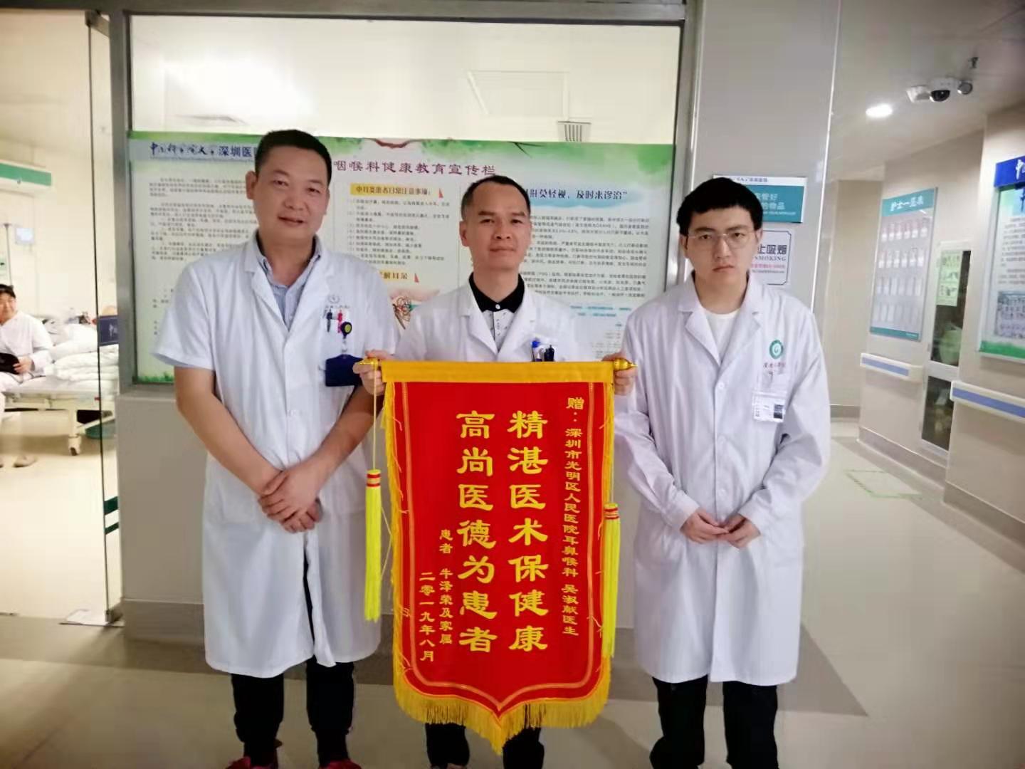 8月27日,党员、耳鼻喉科医生吴淑献收到患者家属送来的锦旗。患儿牛泽荣,今年10岁,受睡眠打鼾张口呼吸困扰3年,家人非常担心。慕名来我院耳鼻喉科就诊,手术后当晚睡眠打鼾症状即消失,家人欣喜万分,特送锦旗以表谢意。(通讯员 康喜讯)