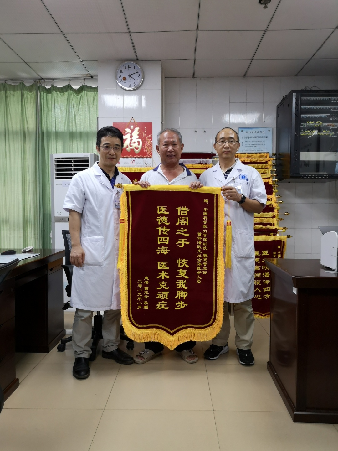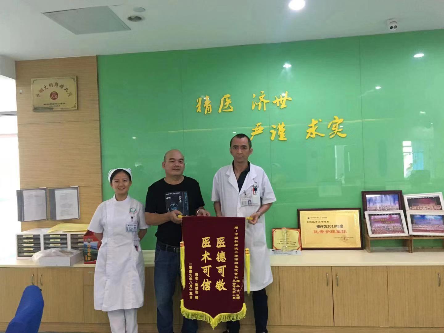 近日,党员、脊柱关节科魏思奇主任团队收到一面锦旗。曾先生患重度色素沉着绒毛结节性滑膜炎,曾在广州一家大医院进行了两次关节镜手术,术后病情比以前更严重,最后无法下地行走。得知国科大深圳医院从郑州大学附属第一医院引进了脊柱关节科专家魏思奇主任医师、教授,慕名从梅州老家来我院就诊。魏主任团队为其做了全膝关节置换手术,术后第二天患者就能正常下床行走,后期恢复良好,患者非常满意,特赠送锦旗致谢。(通讯员 黎佰胜)