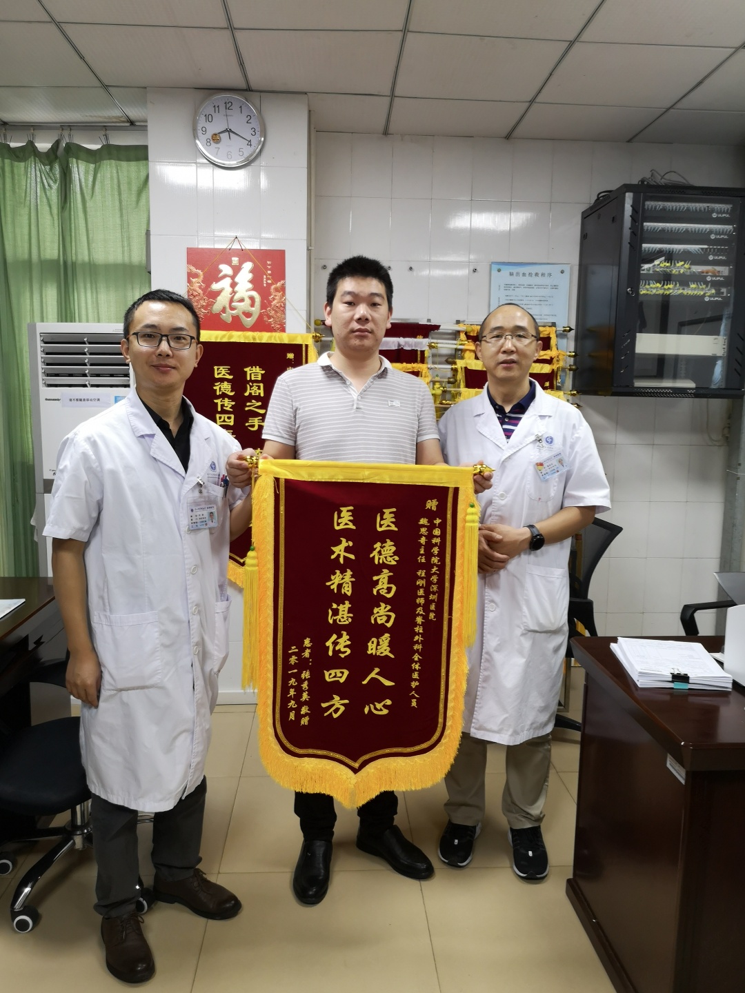 近日,一年前在我院脊柱外科住院的年轻患者张先生给魏思奇主任和程刚医师送来锦旗。 一年前患者因第12胸椎爆裂性骨折在脊柱外科手术治疗,术后半月出院后正常工作,完全恢复劳动力。今住院拆除内固定物出院,为感谢脊柱外科医疗团队高超的技术,周到的服务,特赠锦旗致谢。(通讯员 黎佰胜)