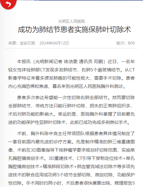 宝安日报:光明区人民医院成功为肺结节患者实施保肺叶切除术