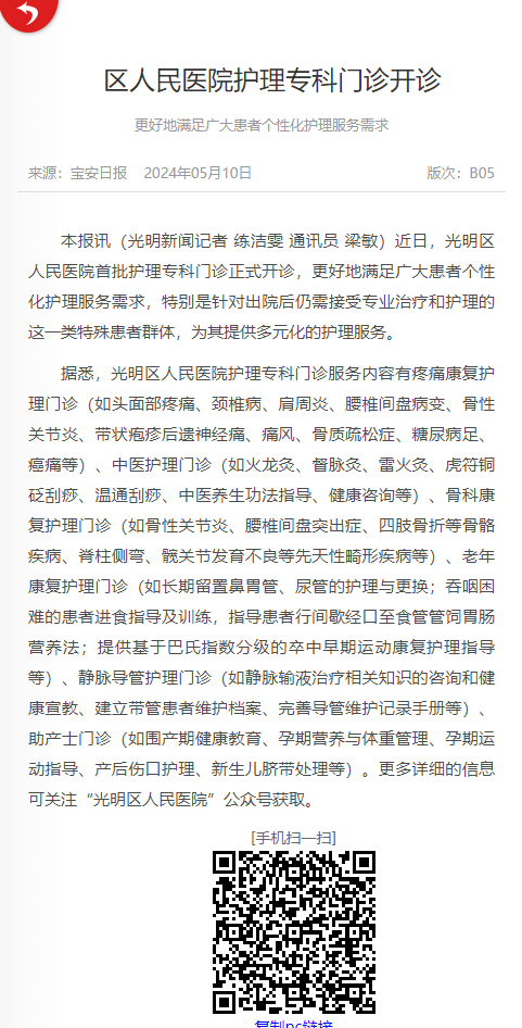 宝安日报:区人民医院护理专科门诊开诊,更好地满足广大患者个性化护理服务需求