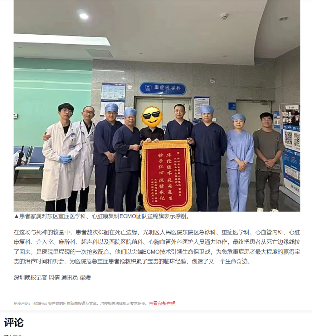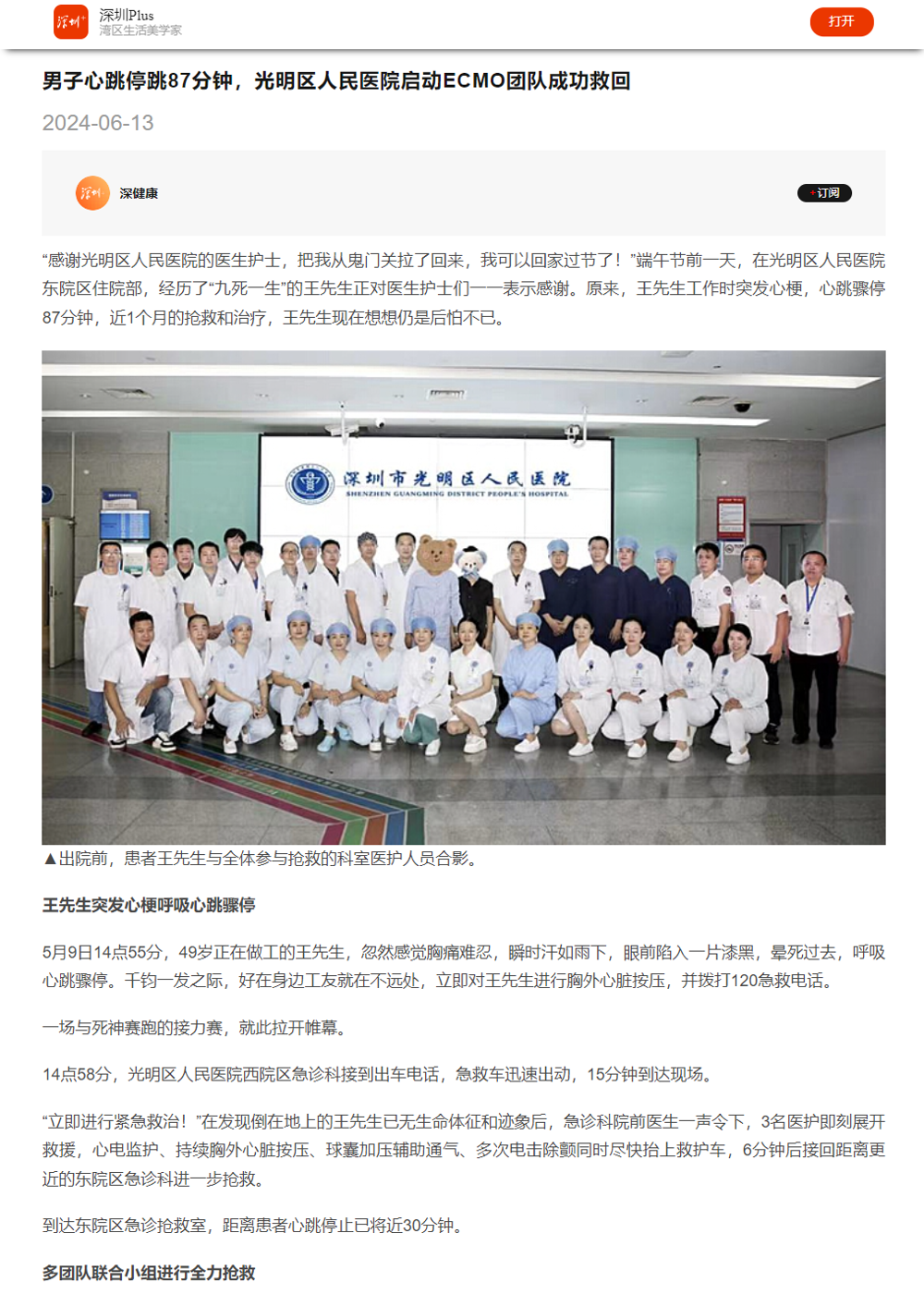 深圳plus:男子心跳停跳87分钟,光明区人民医院启动ECMO团队成功救回