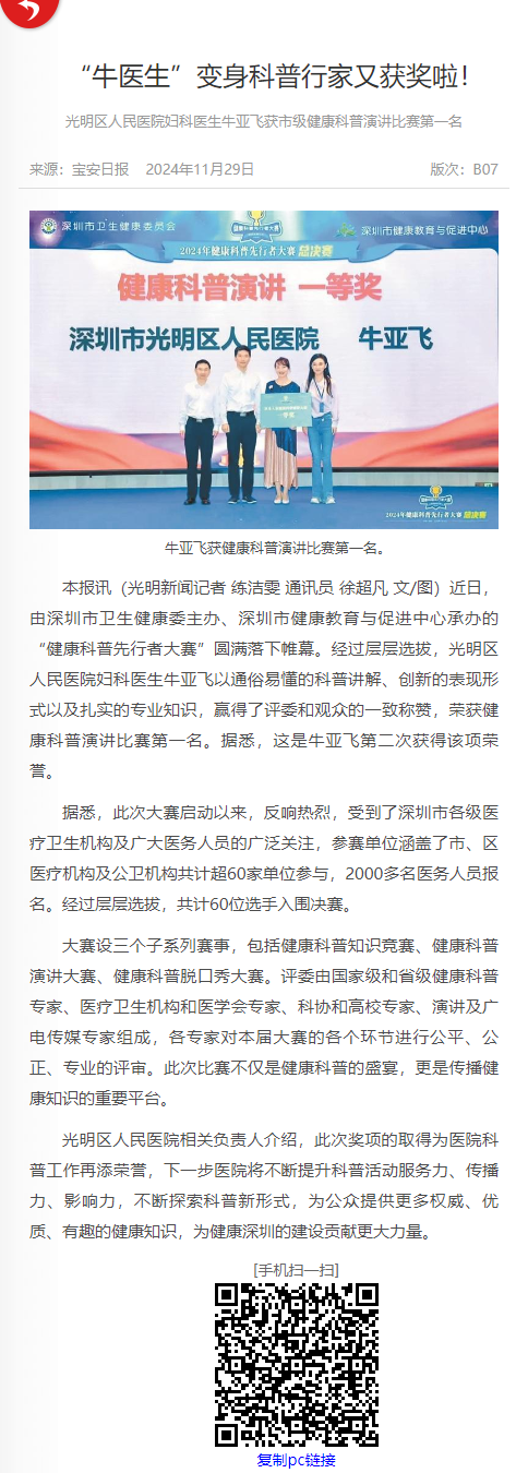 宝安日报:“牛医生”变身科普行家又获奖啦! 光明区人民医院妇科医生牛亚飞获市级健康科普演讲比赛第一名