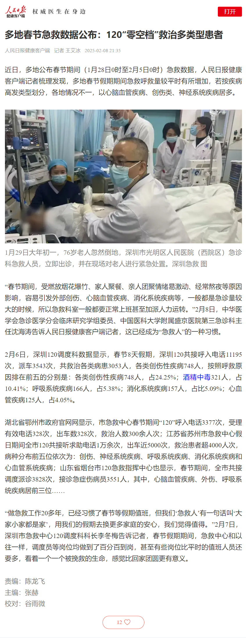 人民日报:多地春节急救数据公布:120“零空档”救治多类型患者