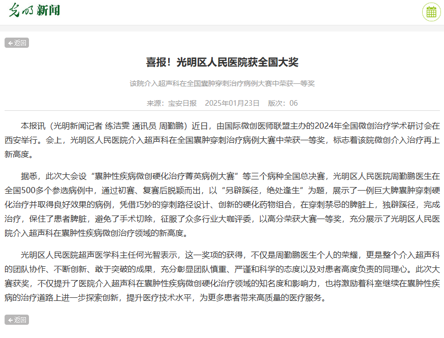 光明新闻:喜报!光明区人民医院获全国大奖 该院介入超声科在全国囊肿穿刺治疗病例大赛中荣获一等奖