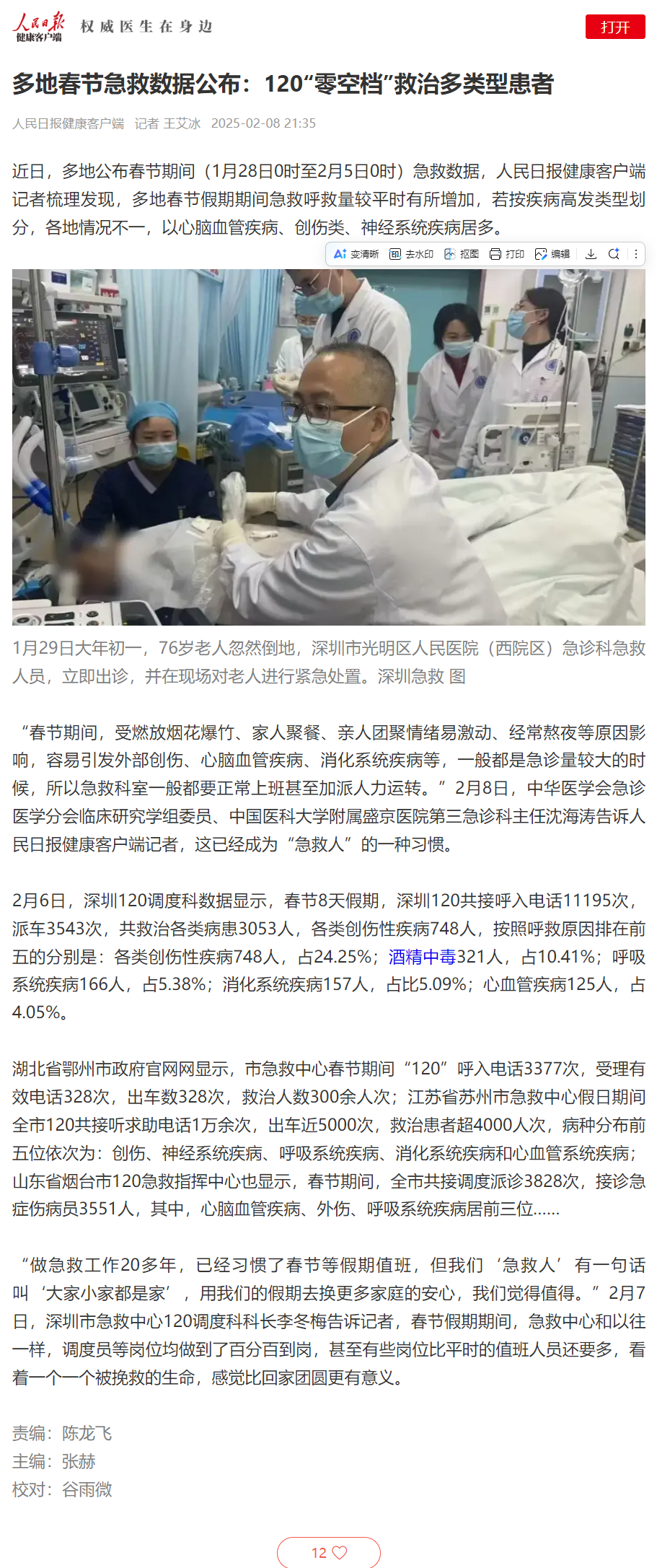 人民日报健康客户端:多地春节急救数据公布:120“零空档”救治多类型患者
