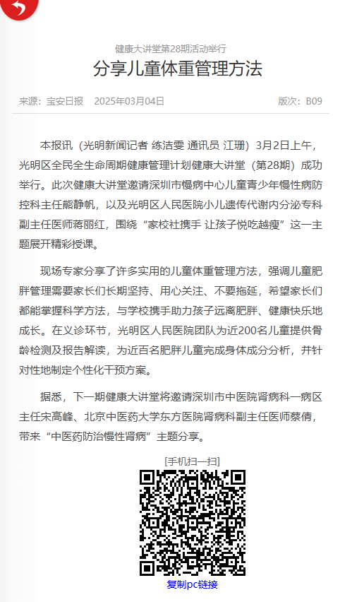 宝安日报:健康大讲堂第28期活动举行 分享儿童体重管理方法