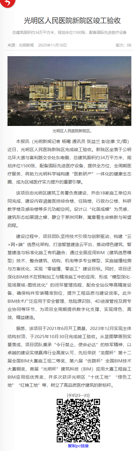 宝安日报:光明区人民医院新院区竣工验收 总建筑面积约34万平方米,规划床位1500张,配备国际先进医疗设备