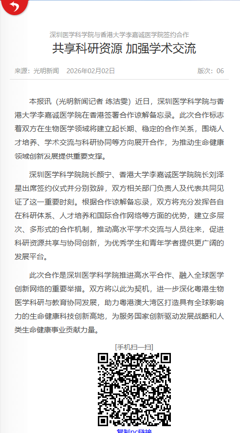 光明新闻:深圳医学科学院与香港大学李嘉诚医学院签约合作 共享科研资源 加强学术交流