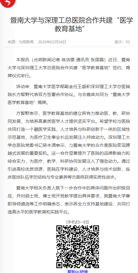 光明新闻:暨南大学与深理工总医院合作共建“医学教育基地”