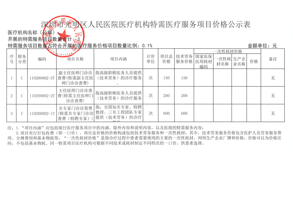 深圳市光明区人民医院医疗机构特需医疗服务项目价格公示表